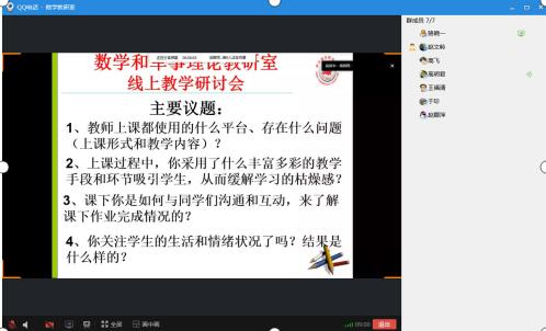 因为疫情原因,本学期线上教学已经进行了四周,为更好地持续做好线上教学工作,9月26日下午两点半到三点半,太阳成集团副主任兼军事理论教研室主任高明君以QQ分享屏幕的形式主持举行了线上教学研讨会,数学教研室和军事理论教研室共计7人参加,每位老师都从以下几个方面做了积极的发言: