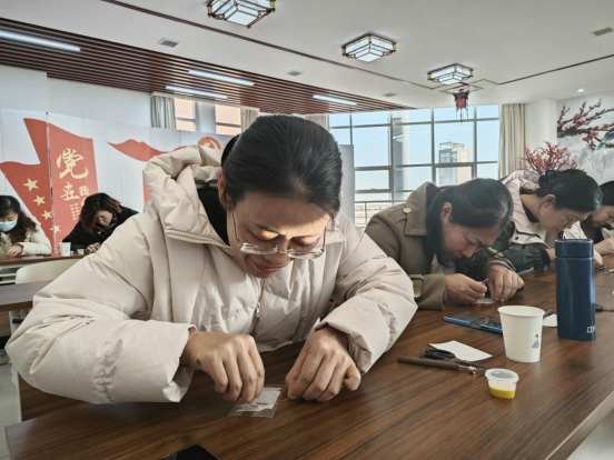 掐丝珐琅是中国著名的特种金属工艺品之一,属于国家级非物质文化遗产。活动开始,赵老师生动介绍了掐丝珐琅这一非物质文化遗产的深厚历史渊源、鲜明艺术特色以及文化价值。在制作环节,全体教师集体参与制作掐丝珐琅胸针。在底板上勾勒图案轮廓,用镊子将纤细的金属丝弯曲成型并精准粘贴,再用珐琅釉料为图案上色,每一步都能感受到掐丝珐琅制作的工艺之美和匠心精神。
