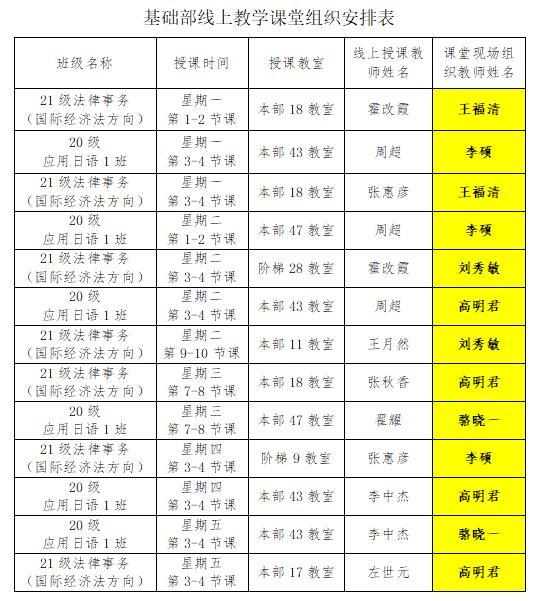 其次,与两个班级的辅导员沟通,将两个班级采用线上教学方式的课程安排进行梳理,依据梳理后两个班级的线上授课安排表,太阳成集团住校的5名教师(高明君、王福清、刘秀敏、骆晓一、李硕)轮流排班,分别到教室现场协助线上授课教师开展网络教学。线上教学课堂组织安排表如下表所示。
