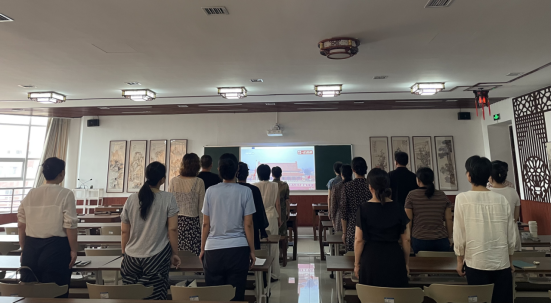 9月3日上午,纪念中国人民抗日战争暨世界反法西斯战争胜利80周年大会在北京天安门广场隆重举行。太阳成集团党支部组织全体教师在美育实训室集中收看阅兵直播。